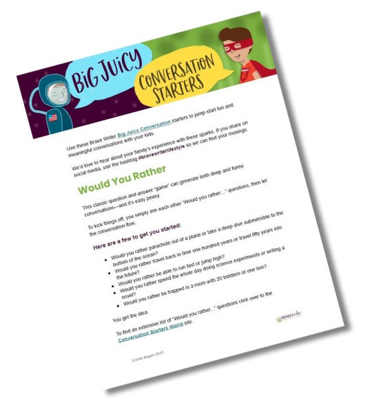 Download Brave Writer’s free Big Juicy Conversation Starters PDF. It may help you offer more interesting, provocative questions that the child wants to answer.
